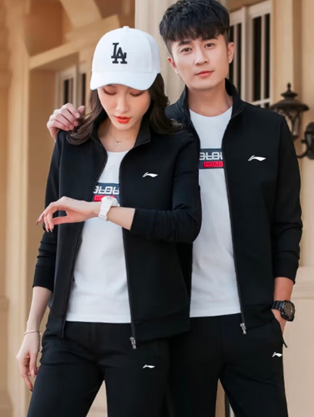 李宁情侣运动套装春秋季新款男女士休闲运动服两件套跑步套装 黑色(立领+束口)加绒+棉混纺 L/175